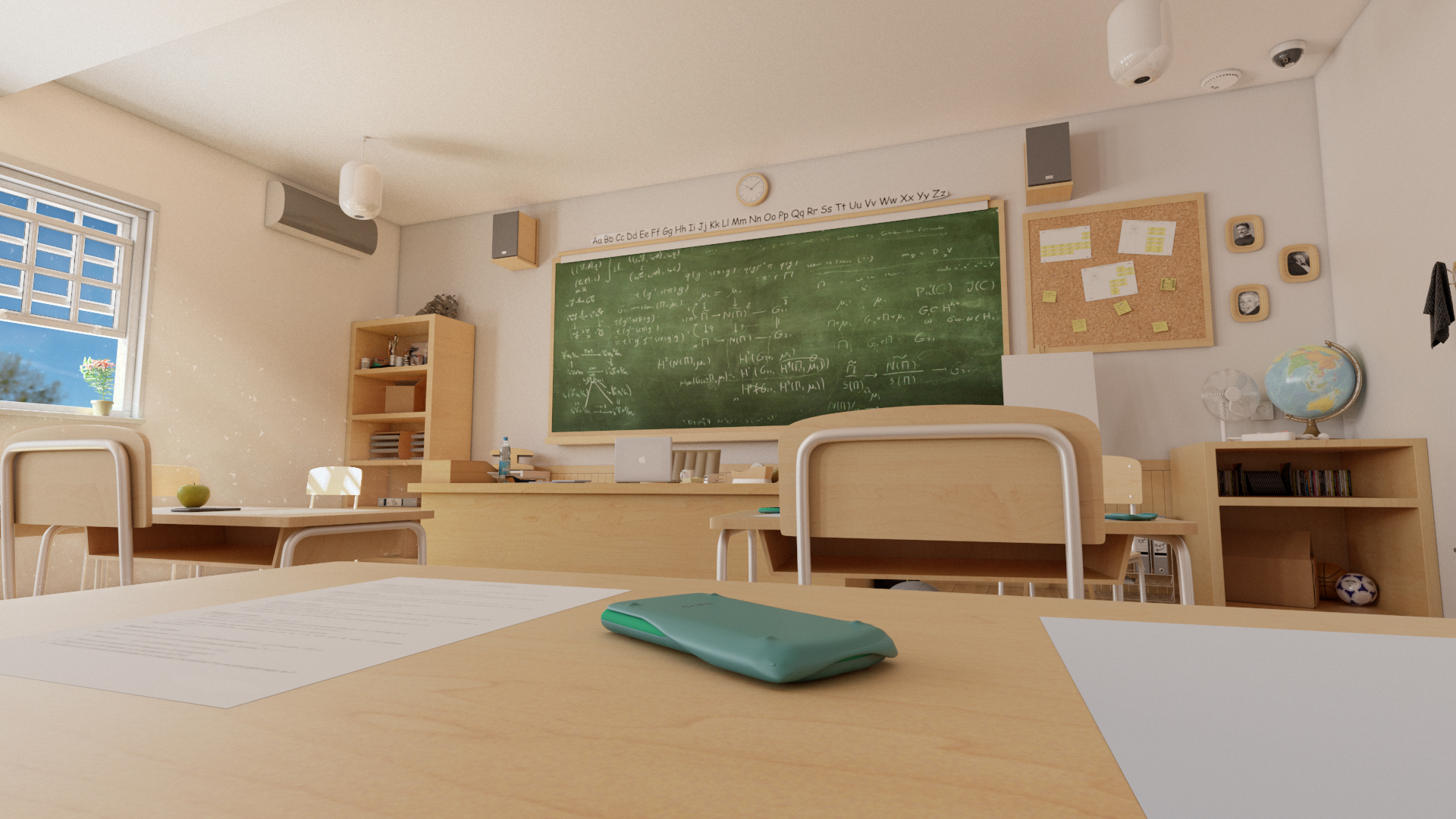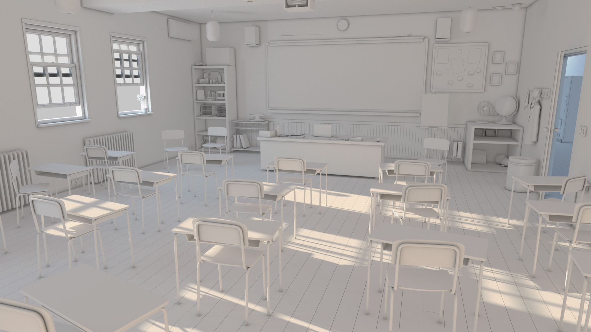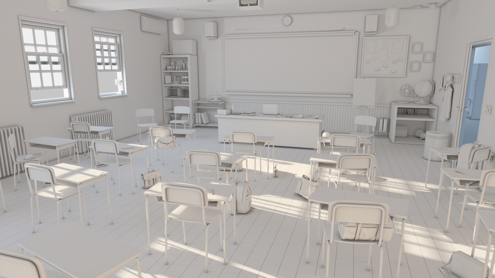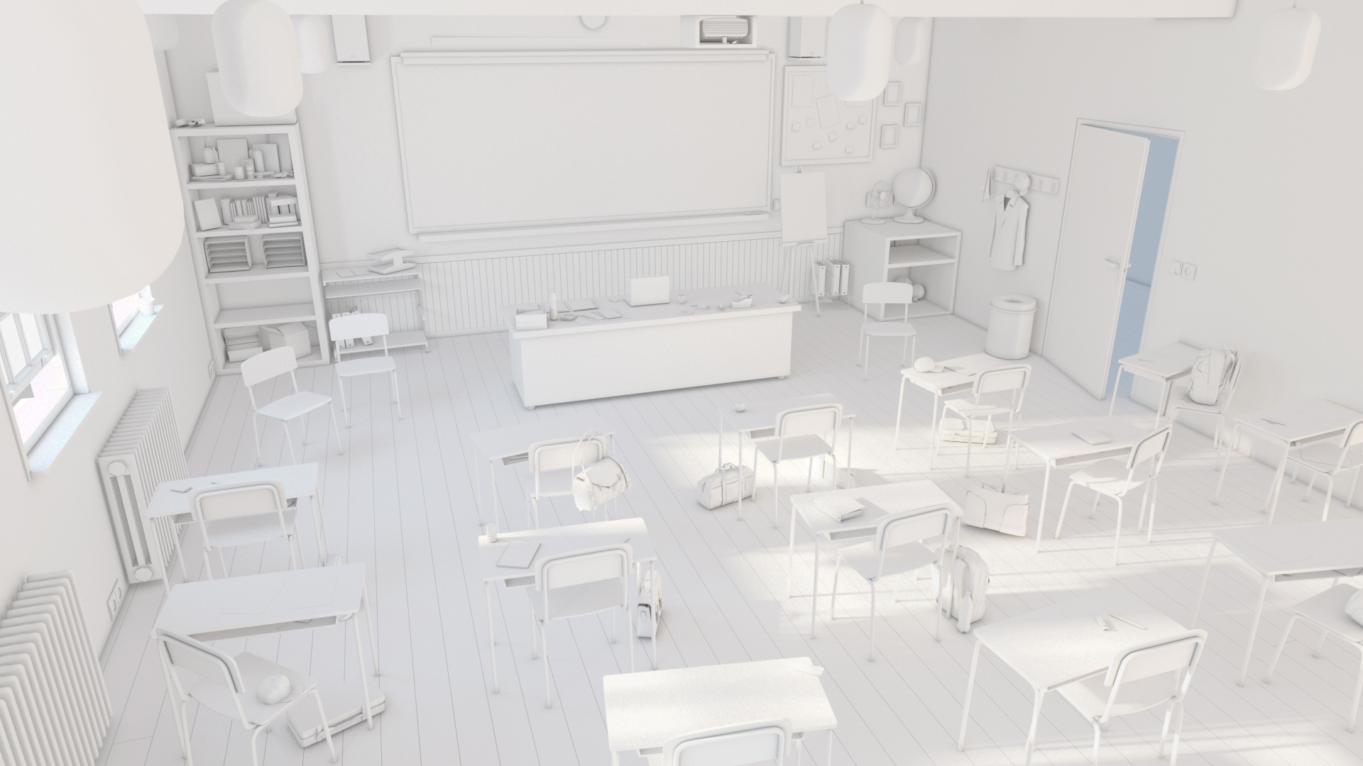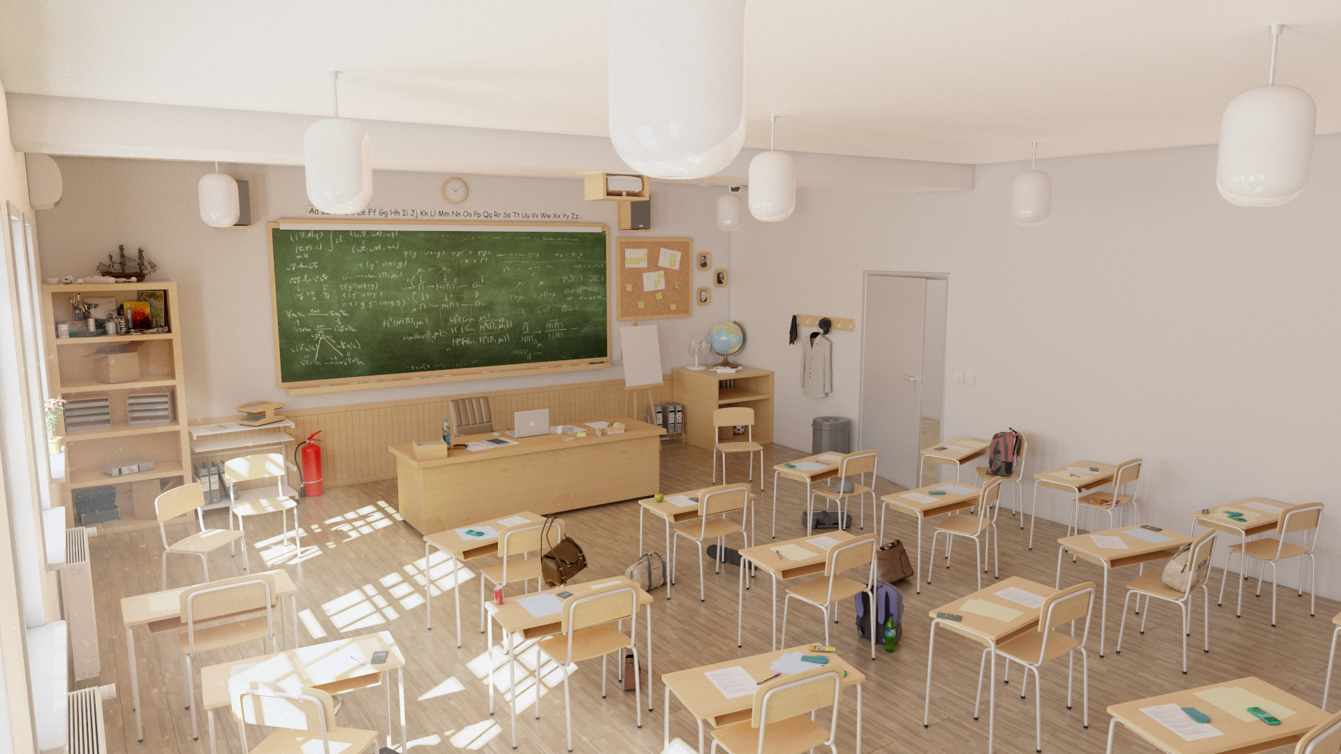 I started by creating the furniture in order to have a base in which I then added all the elements that a classroom can have such as pens, bags, notebooks, etc.. Apart from the furniture, I didn't model everything. However, I retextured almost everything… I finally lit up the classroom and rendered the final scene.