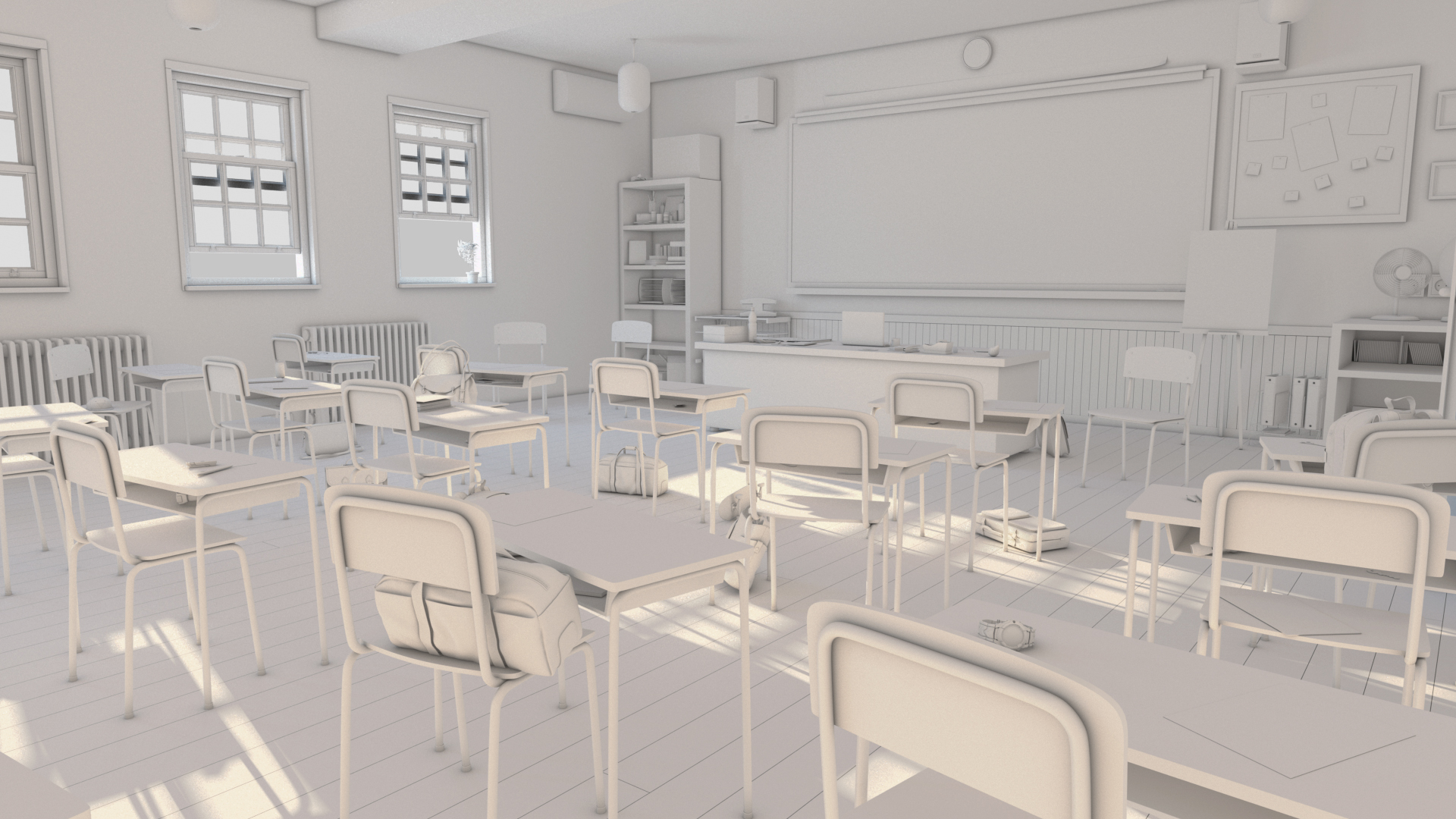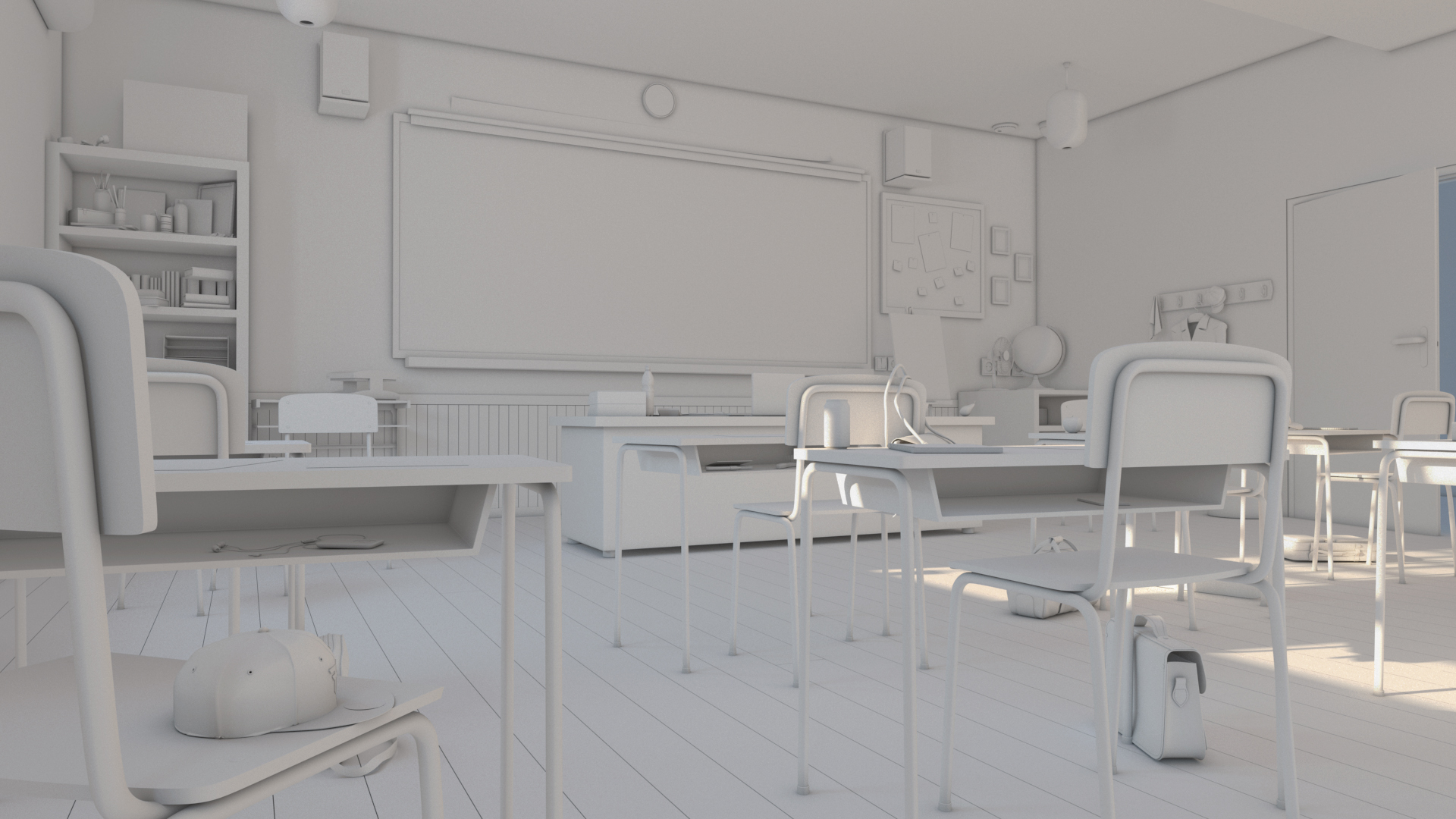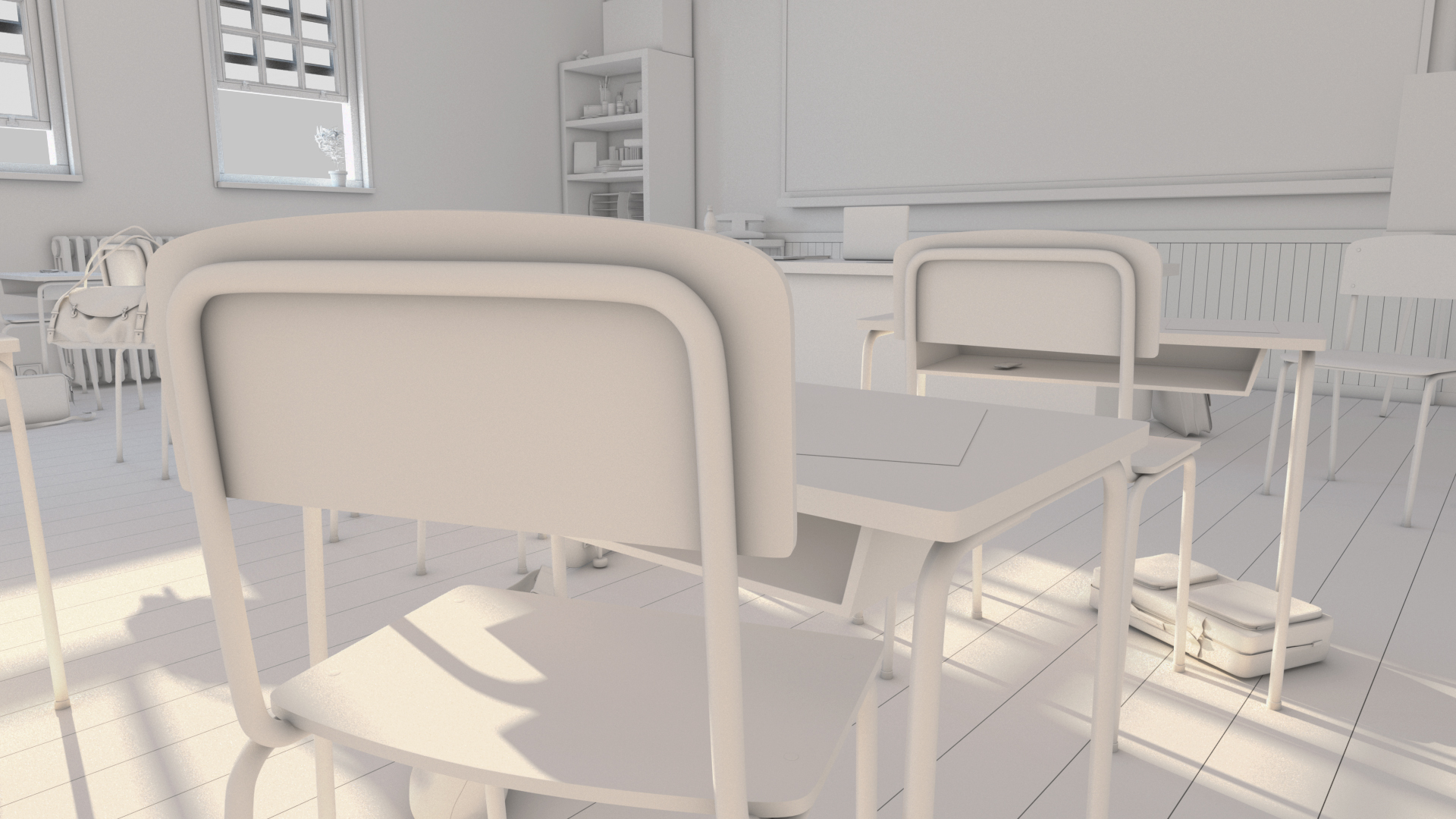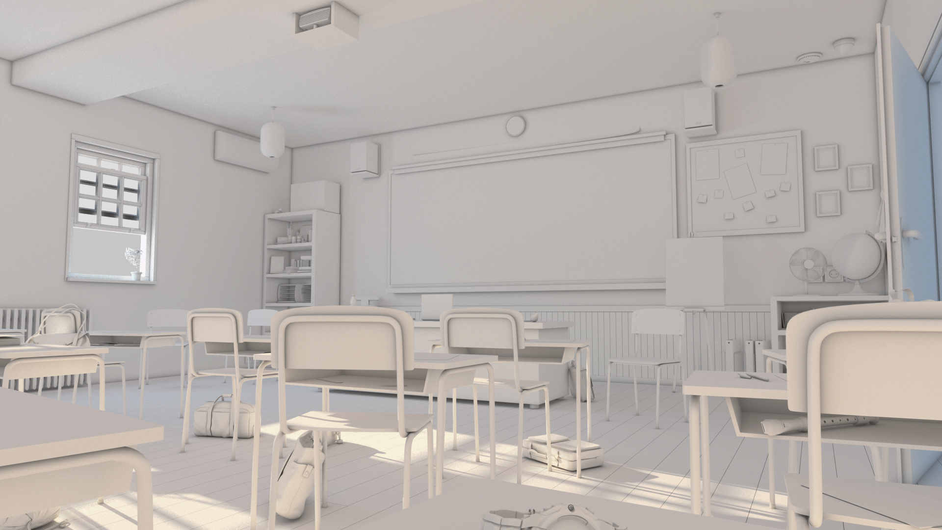 I started by creating the furniture in order to have a base in which I then added all the elements that a classroom can have such as pens, bags, notebooks, etc.. Apart from the furniture, I didn't model everything. However, I retextured almost everything… I finally lit up the classroom and rendered the final scene.