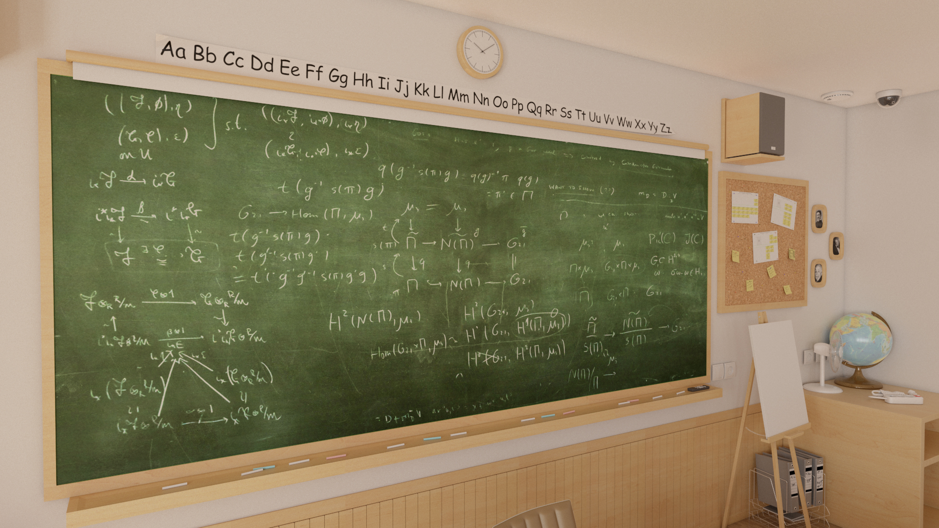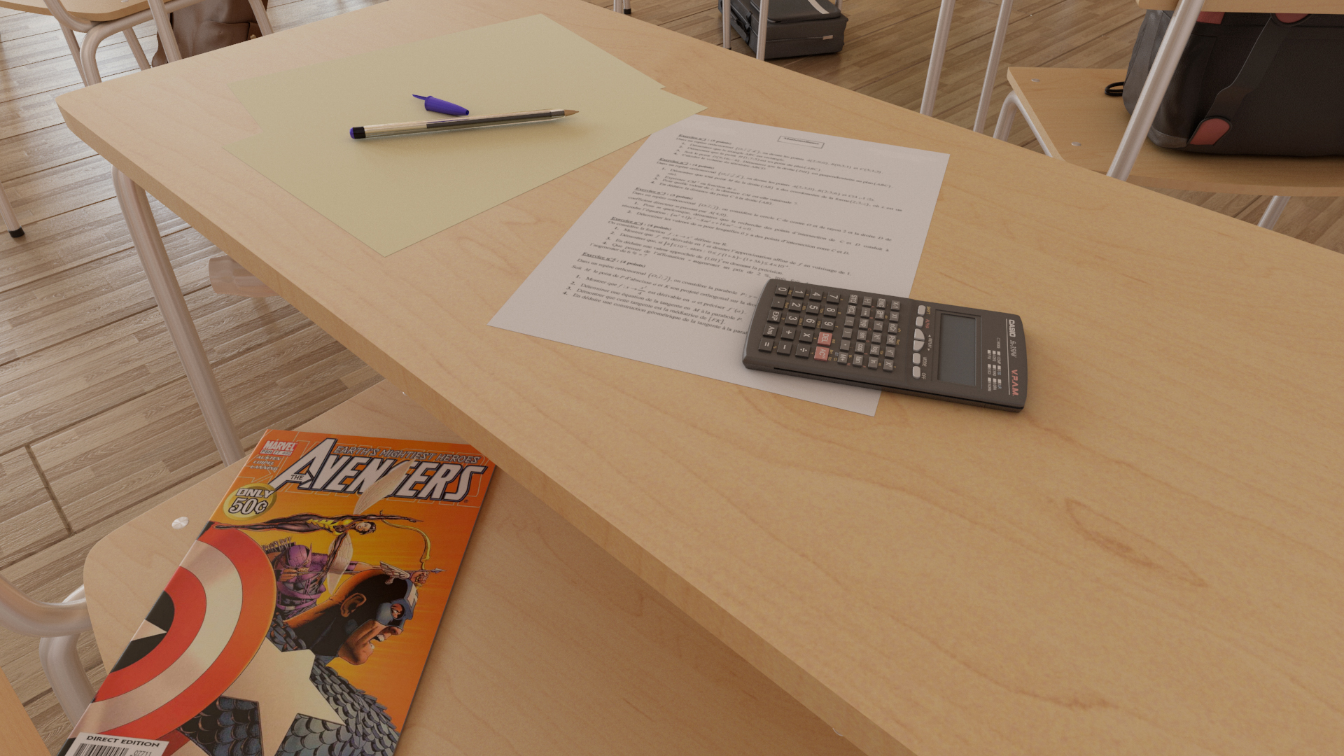 J'ai commencé par créer le mobilier afin d'avoir une base dans laquelle j'ai ensuite ajouté tous les éléments qu'une salle de classe peut avoir comme des stylos, des sacs, des cahiers, etc. Mis à part le mobilier, je n'ai pas tout modélisé. En revanche, j'ai quasiment tout re texturé.. J'ai enfin éclairé la classe et rendu la scène finale.